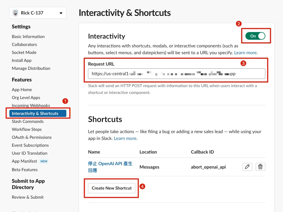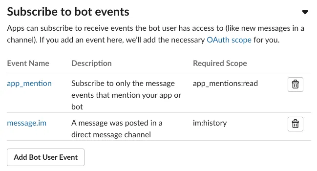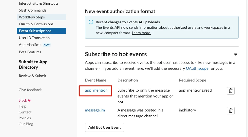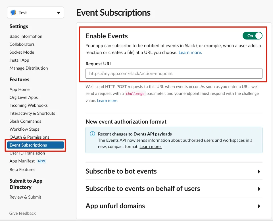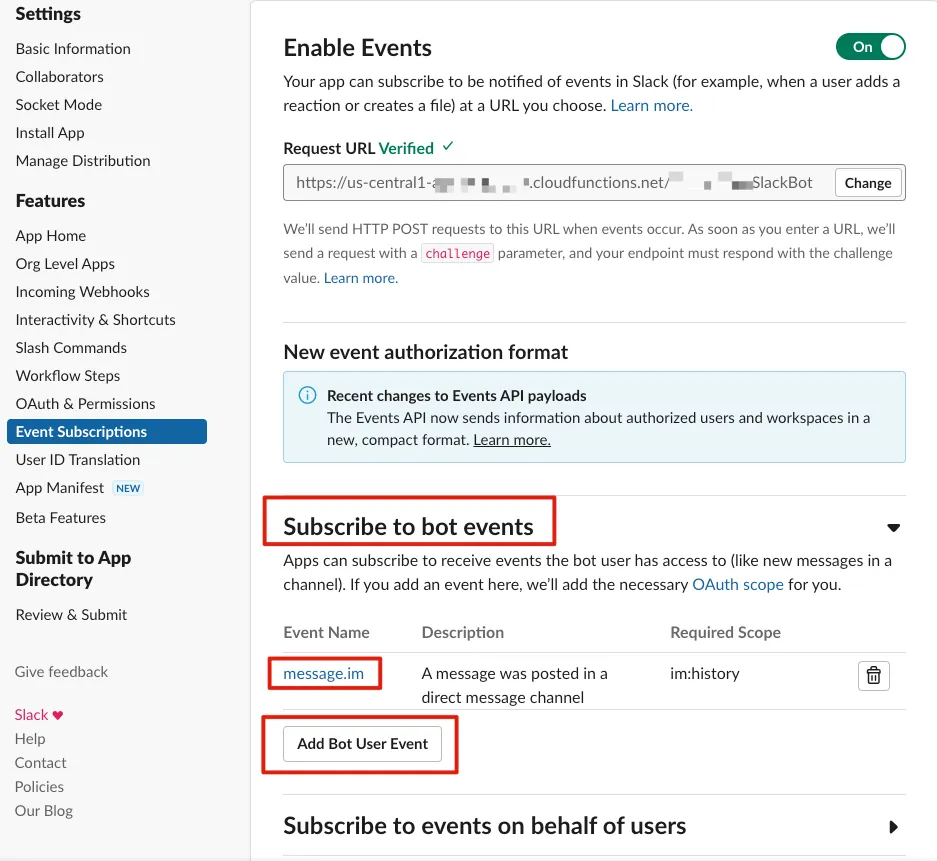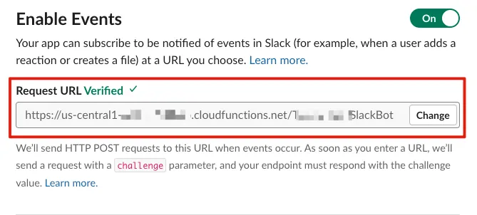 Next, we need to enable the event subscription feature of the Slack App, which will send an API call to the specified URL when a designated event occurs.