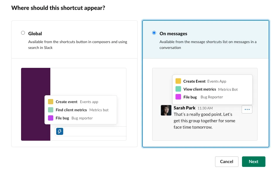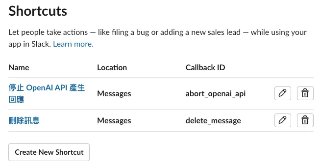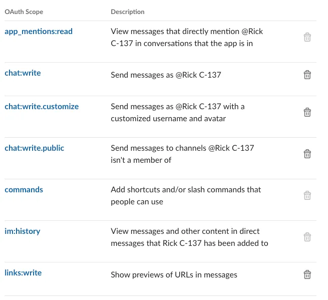 - Items with disabled delete buttons are permissions automatically added by Slack after adding the Shortcut.