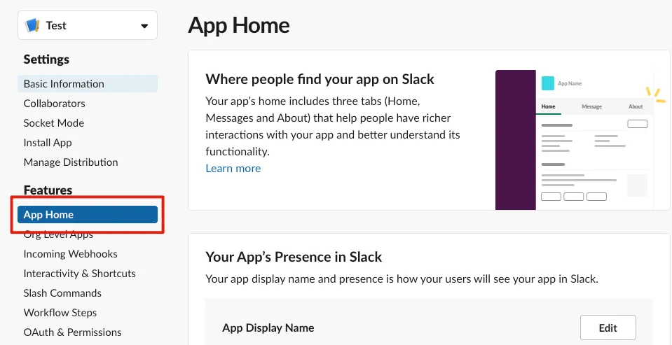 After setting the Slack Bot Token permissions, go to “App Home”: