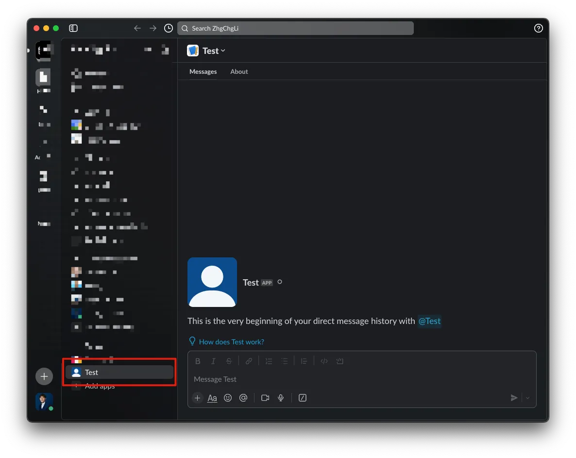 Back in the Slack Workspace, press “Command+R” to refresh the screen and see the newly created Slack App and message input box: