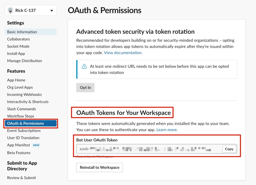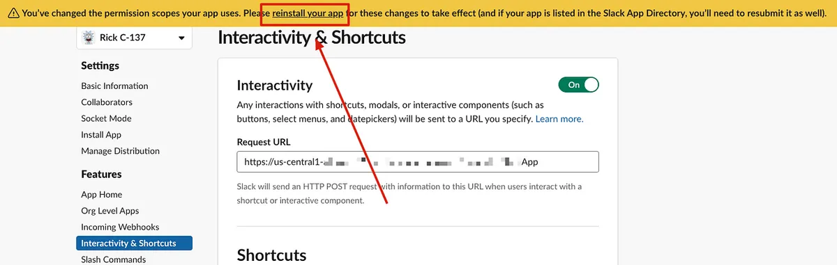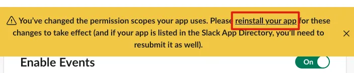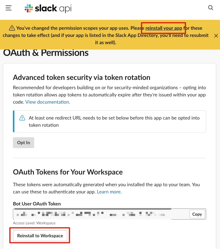 If the Slack App adds new permissions in the future, you will need to click “Reinstall” again for them to take effect.
