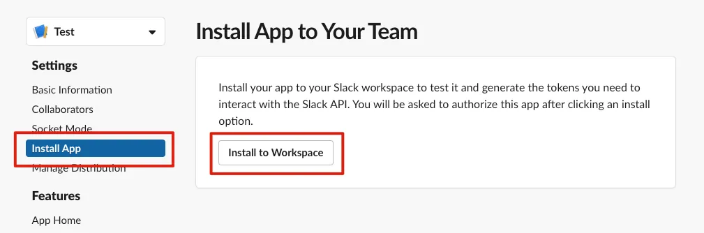 After adding Bot permissions, click “Install App” on the left -> “Install to Workspace”
