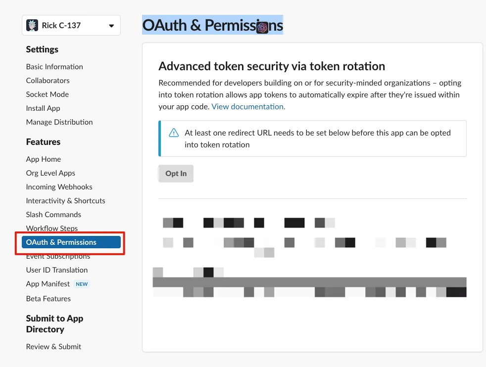 After creation, go to “OAuth & Permissions” to add the required permissions for the Bot.