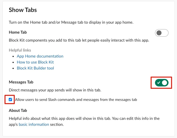 Scroll down to the “Show Tabs” section, enable the “Messages Tab” and “Allow users to send Slash commands and messages from the messages tab” (if this is not checked, you still can’t send messages, and it will show “Sending messages to this app has been turned off.”).