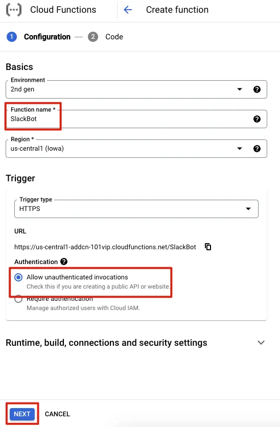 Function name: Enter the project name. Authentication: Select “Allow unauthenticated invocations,” which means anyone with the URL can access it.