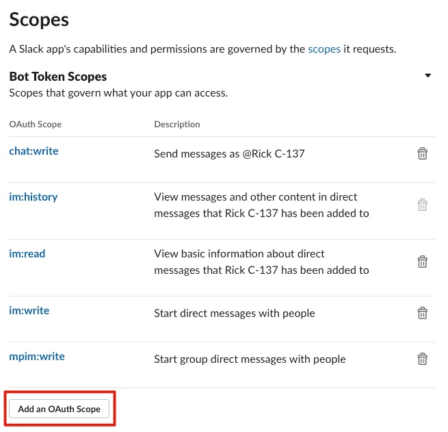 Scroll down to the “Scopes” section, click “Add an OAuth Scope,” and search to add the following permissions: