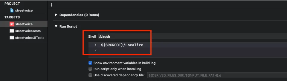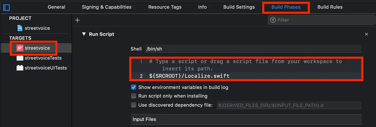 ${SRCROOT}/Localize.swiftOpen Project Settings → iOS Target → Build Phases → Top left corner “+” → New Run Script Phase → Paste the script path in the Script content, e.g.,