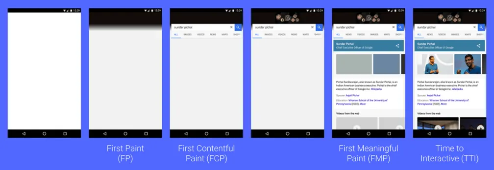 參考 wedevs 優化建議 ,前端 HTML 頁面應該會有四個載入階段,從一開始載完頁面檔案 ( .html) First Paint (空白頁) 到 First Contentful Paint (渲染出頁面骨架) 再到 First Meaningful Paint (補上頁面內容) 到 Time To Interactive(最後可讓使用者互動)。