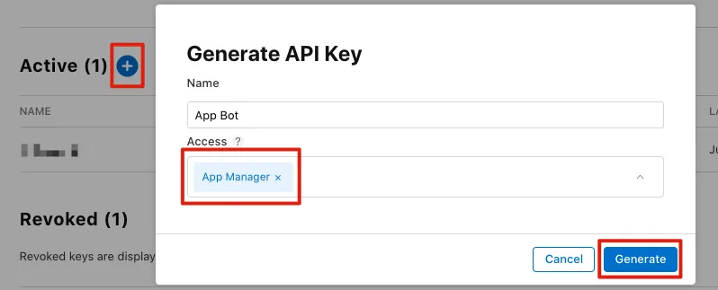 点击「+」,输入名称和权限;权限细则可参考官网说明,为了减少测试问题,这边先选择「App Manager」把权限开到最大。