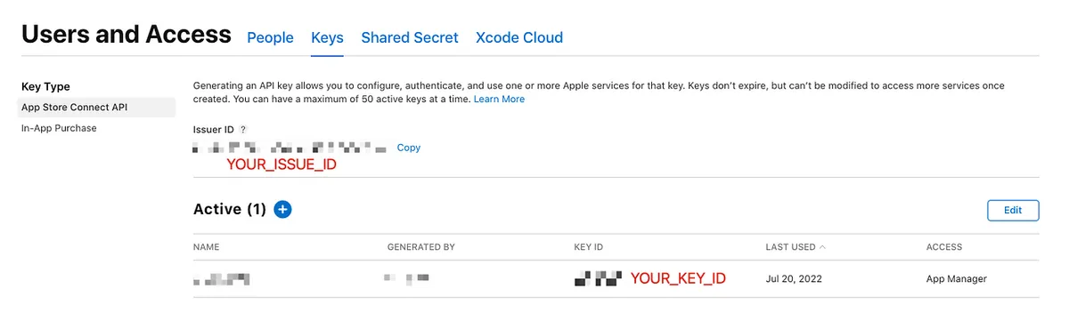 首先我们要登入 App Store Connect 后台,前往「Users and Access」->「Keys」->「 App Store Connect API 」: