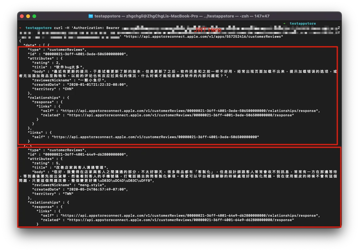 成功!🚀 我们现在可以使用这个方式捞取 App 评价,资料完整且可以完全交给机器执行,不需人工例行维护 (JWT 虽会过期,但是 Private Key 不会,我们每次请求都可借由 Private Key 签名产生 JWT 去存取即可)。
