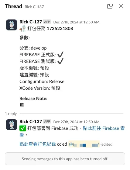 - 伙伴可以直接在 Slack 中使用表单填写资讯、并触发 CD 打包、收到 Slack 通知