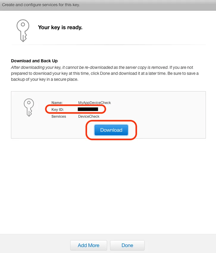 最后一步建立完成后, 记下 Key ID 及点击「Download」下载回 privateKey.p8 私钥档案.
