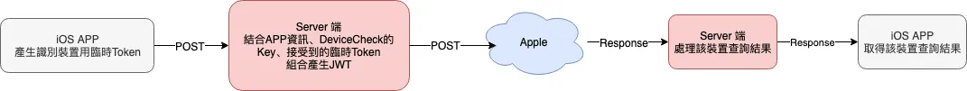 iOS APP 这边透过DeviceCheck API产生一组识别装置用的临时Token,传给后端再经由后端组合开发者的private key资讯、开发者资讯成JWT格式后转传给Apple伺服器;后端取得Apple回传结果后处理完格式再丢回iOS APP.