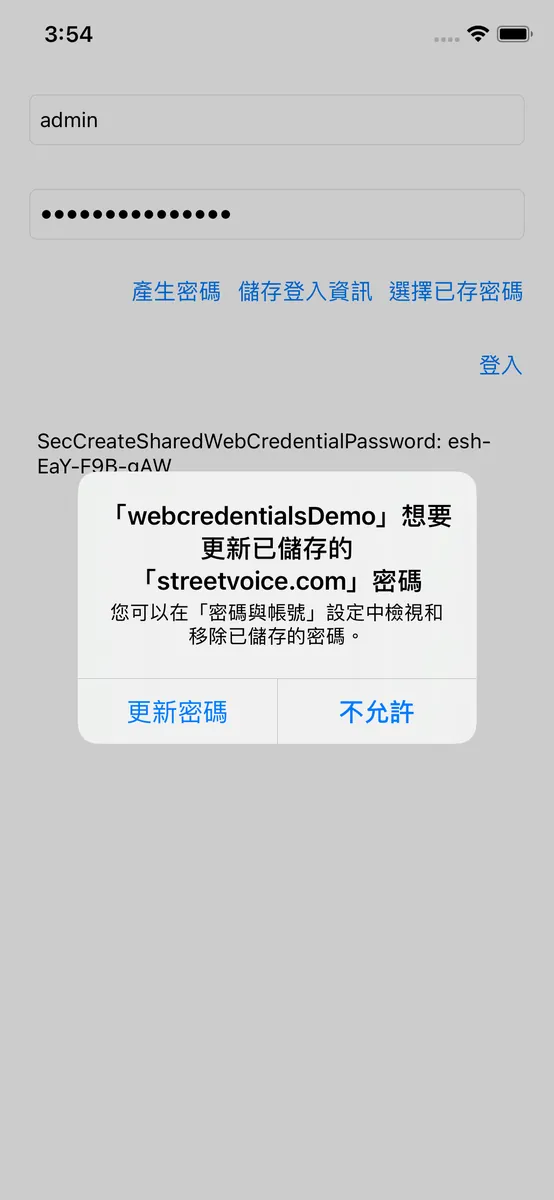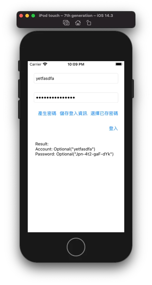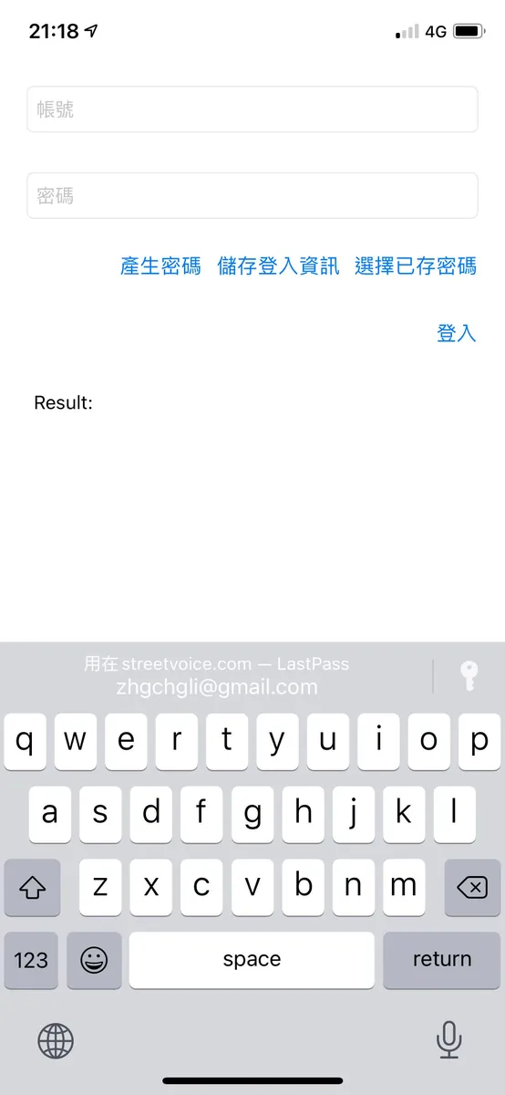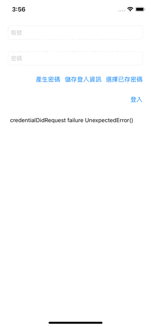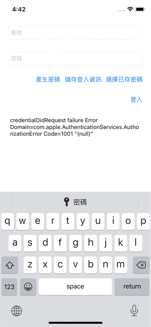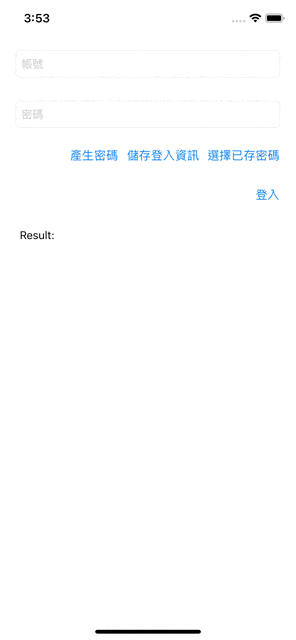 不啰唆,先上完成效果图;第一眼看到可能会以为是 iOS ≥ 11 Password AutoFill 功能;不过请您仔细看,键盘并没有跳出来,而且我是点击「选择已存密码」按钮才跳出帐号密码选择视窗的。