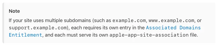 摘录官方文件,如果是 subdomains 则都须列在 Associated Domains 之中。