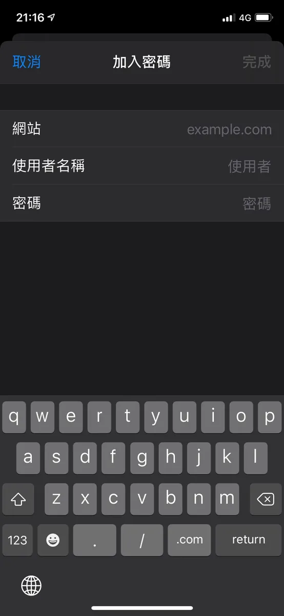 抑或是该网站没有已存在的密码,一样可在「设定」->「密码」-> 右上角「+ 新增」-> 新增。