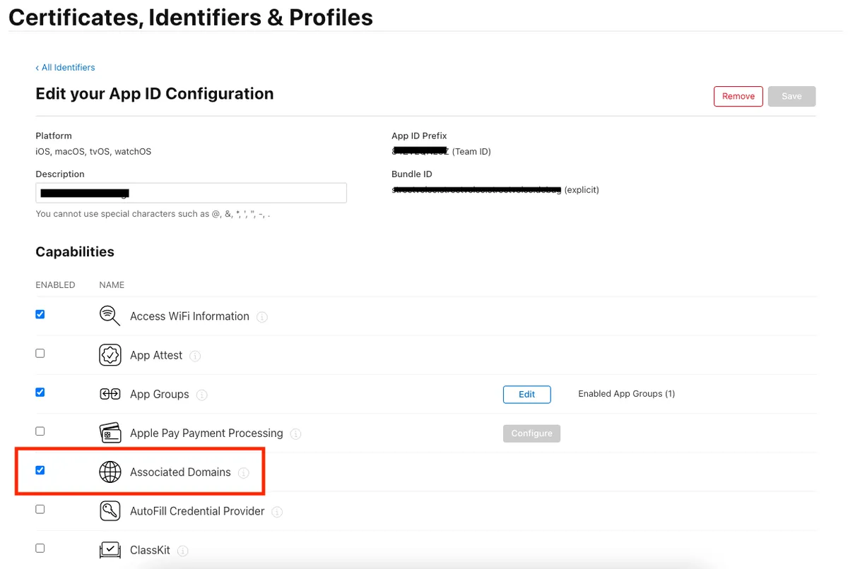3.进入「Certificates, Identifiers & Profiles」->「Identifiers」-> 找到你的专案 -> 打开「Associated Domains」功能