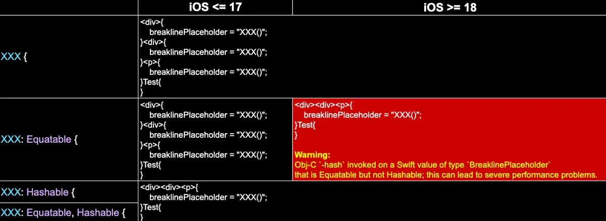 invoked on a Swift value of typeBreaklinePlaceholder` that is Equatable but not Hashable; this can lead to severe performance problems.