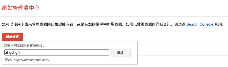 1. 前往 http://google.com/webmasters/verification 2. 點擊「 新增資源 」輸入「 您的網域」 點擊 「繼續」