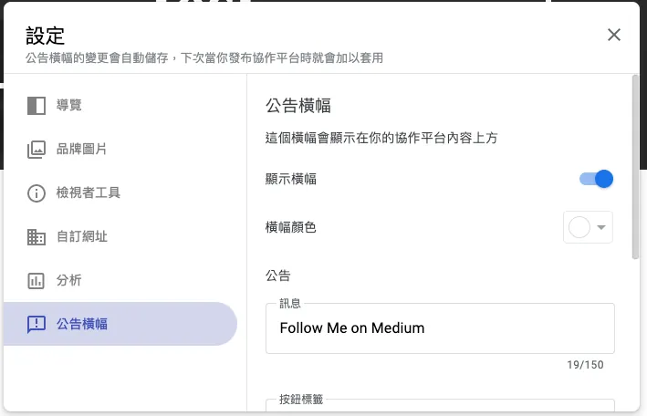 點擊右上角「 齒輪(設定) 」選擇「 公告橫幅 」即可設定,設定完別忘了回到頁面按「 發布 」才會生效喔!