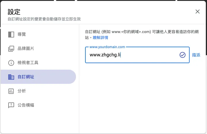 點擊右上角「 齒輪(設定) 」選擇「 自訂網址 」輸入想要指派的網域名稱,或你想用的子網域,按「 指派 。