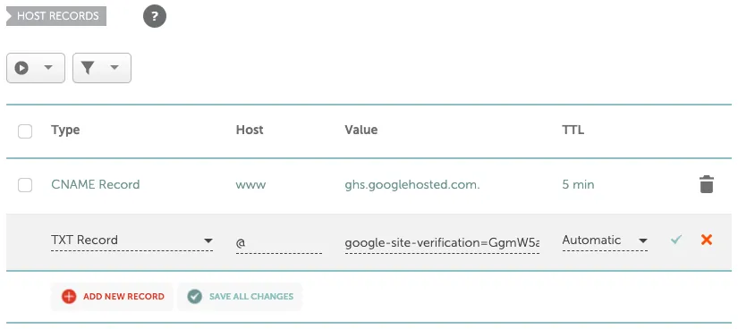 再新增一筆紀錄,類型選「 CNAME Record 」、主機輸入「 www (或你想用的子網域) 」、值輸入「 ghs.googlehosted.com. 」按新增送出。