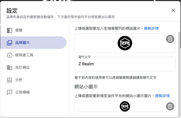 點擊右上角「 齒輪(設定) 」選擇「 品牌圖片 」即可設定,設定完別忘了回到頁面按「 發布 」才會生效喔!
