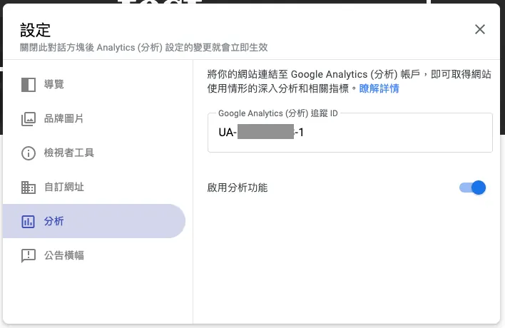 點擊右上角「 齒輪(設定) 」選擇「 分析 」輸入「 GA 追蹤 ID 」即可設定,設定完別忘了回到頁面按「 發布 」才會生效喔!