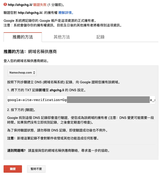 若出現 「驗證資源失敗」 別急!請再稍等一下,如果超過 1 小時都還是無法,再回頭檢查一下設定是否有誤。