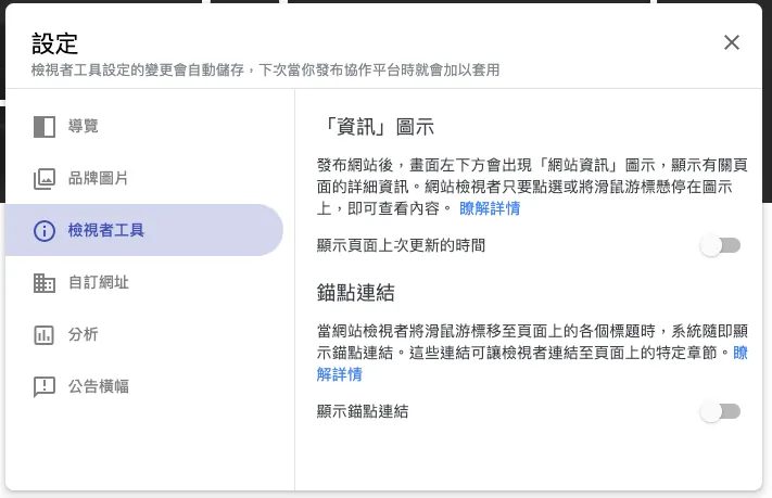 點擊右上角「 齒輪(設定) 」選擇「 檢視者工具 」即可設定,設定完別忘了回到頁面按「 發布 」才會生效喔!