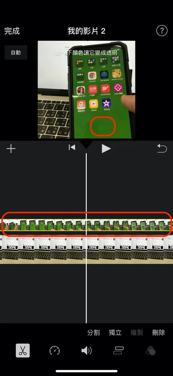 點選上方「入鏡操作影片」->「滾動到有綠色桌布的影格」-> 點擊「綠色區域」-> 完成透視透明