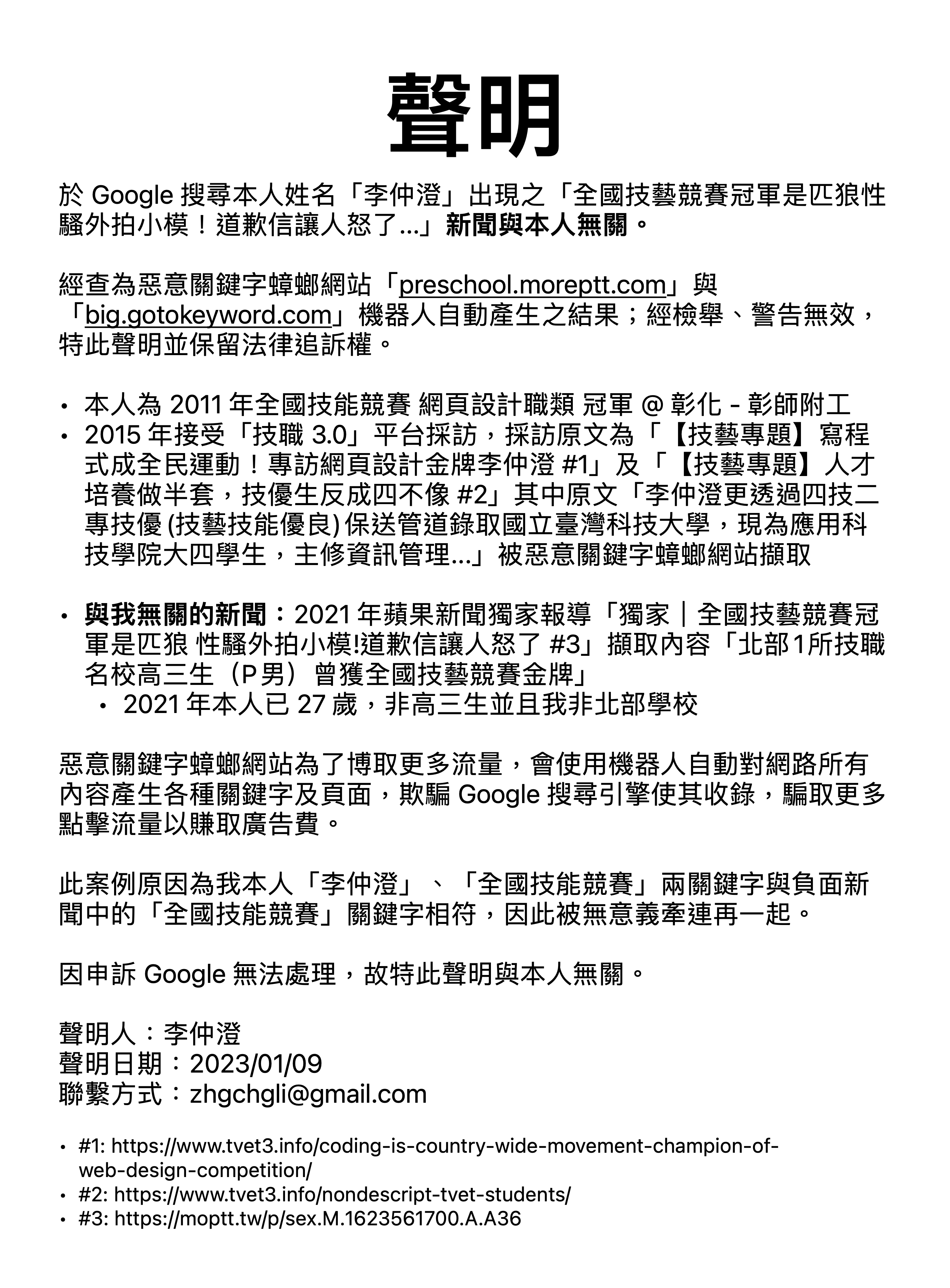 Google 出現與本人李仲澄無關之搜尋結果聲明