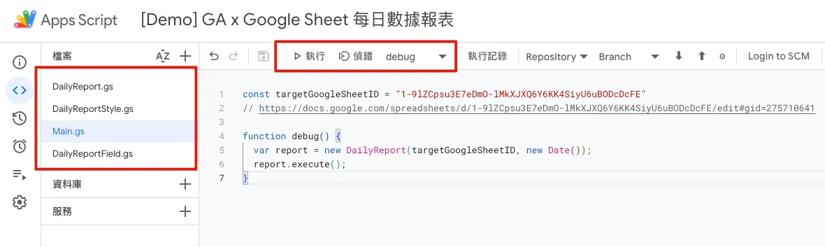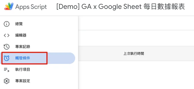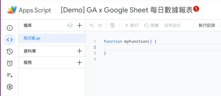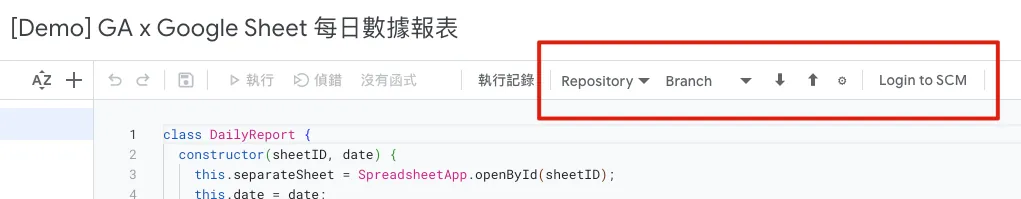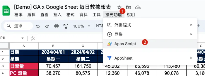 只需在我們要導入自動化的報表上選擇「擴充功能」->「Apps Script」就能自動建立與 Google Sheet 報表連結的 Google Apps Script。
