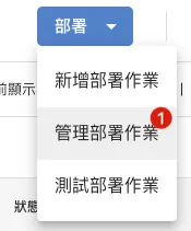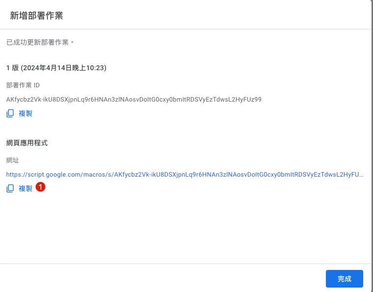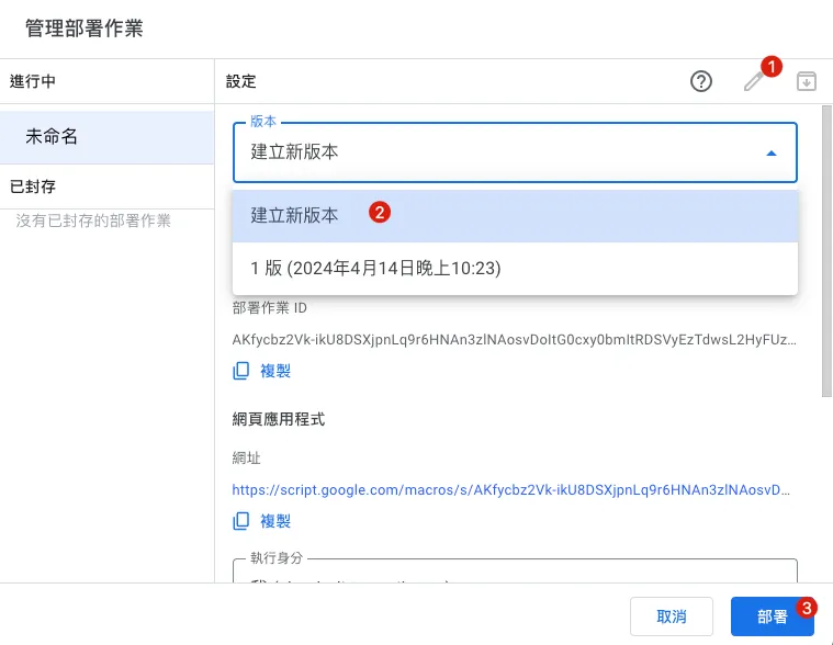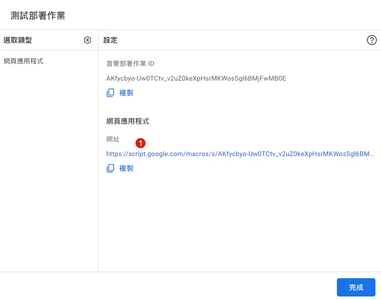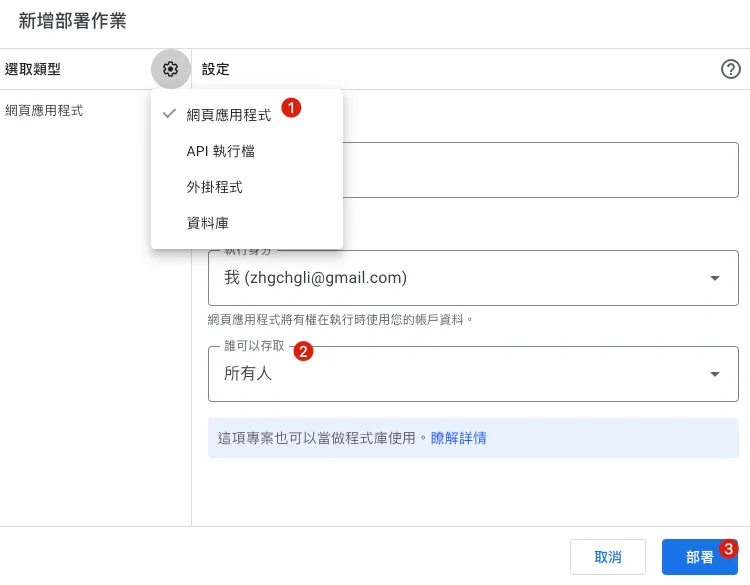 同前文,部署成網頁服務,點擊專案右上角「部署」->「新增部署作業」-> 左上角「選取類型」->「網頁應用程式」: