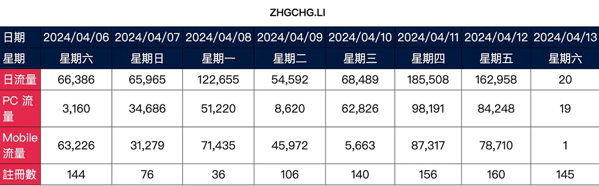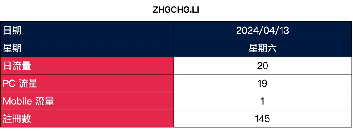 數據為假數據,純 Demo 使用;從 2024/04/13 開始會特別低或都保持在 0,因為我的 zhgchg.li GA 真的是「0」流量 Q_Q。