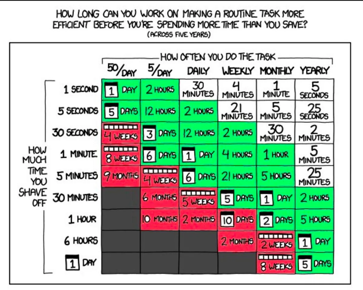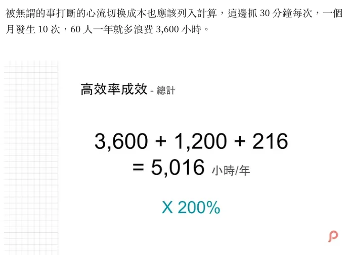之前在「 2021 Pinkoi Tech Career Talk — 高效率工程團隊大解密 」分享過積少成多及心流中斷的成本問題;假設一件例行重複性的工作,每次需要花費 15 分鐘解決,每週會發生 10 次,一年下來就浪費將近 130 小時;如果再算上「心流切換」成本,最終可能浪費近 200 小時一年。