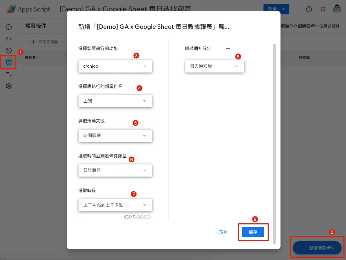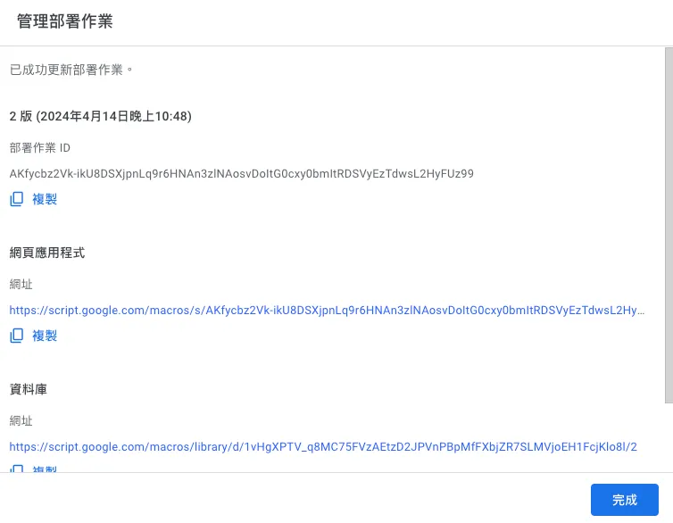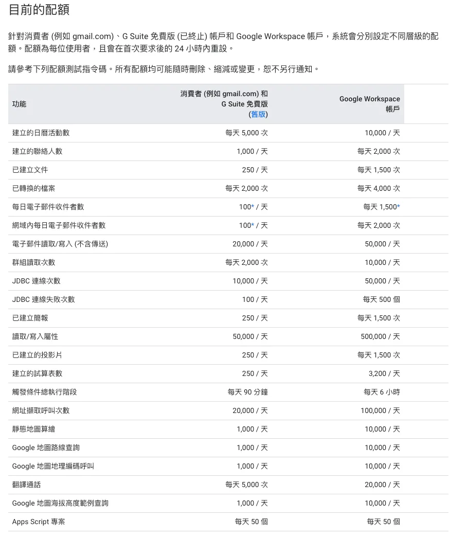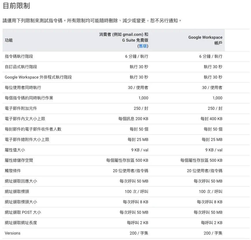 - 其他限制與配額請參考官方的 GAS 資訊 :
