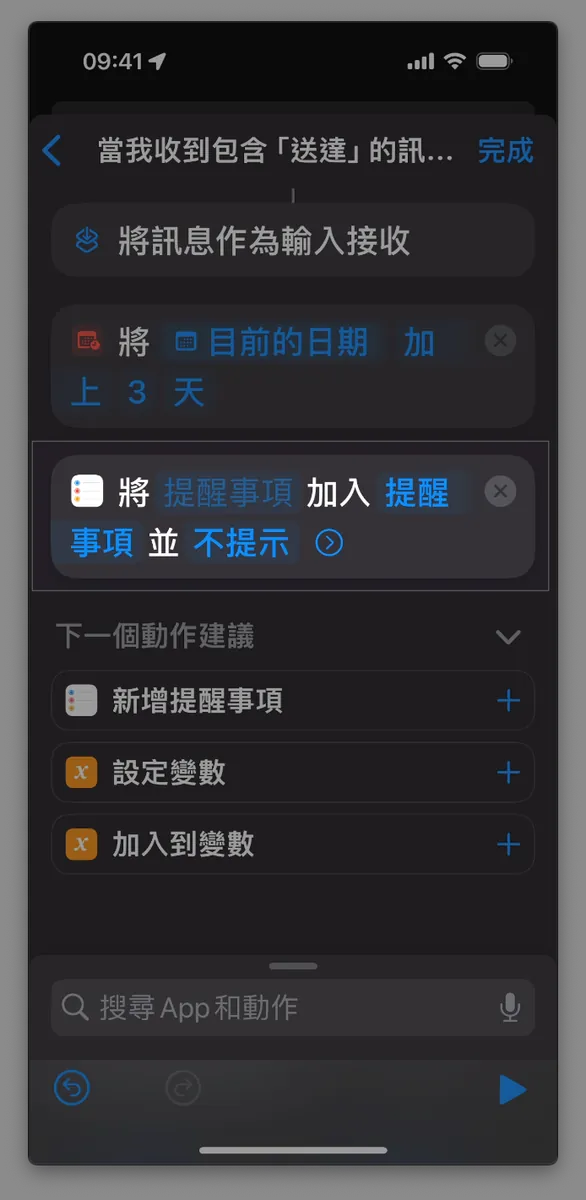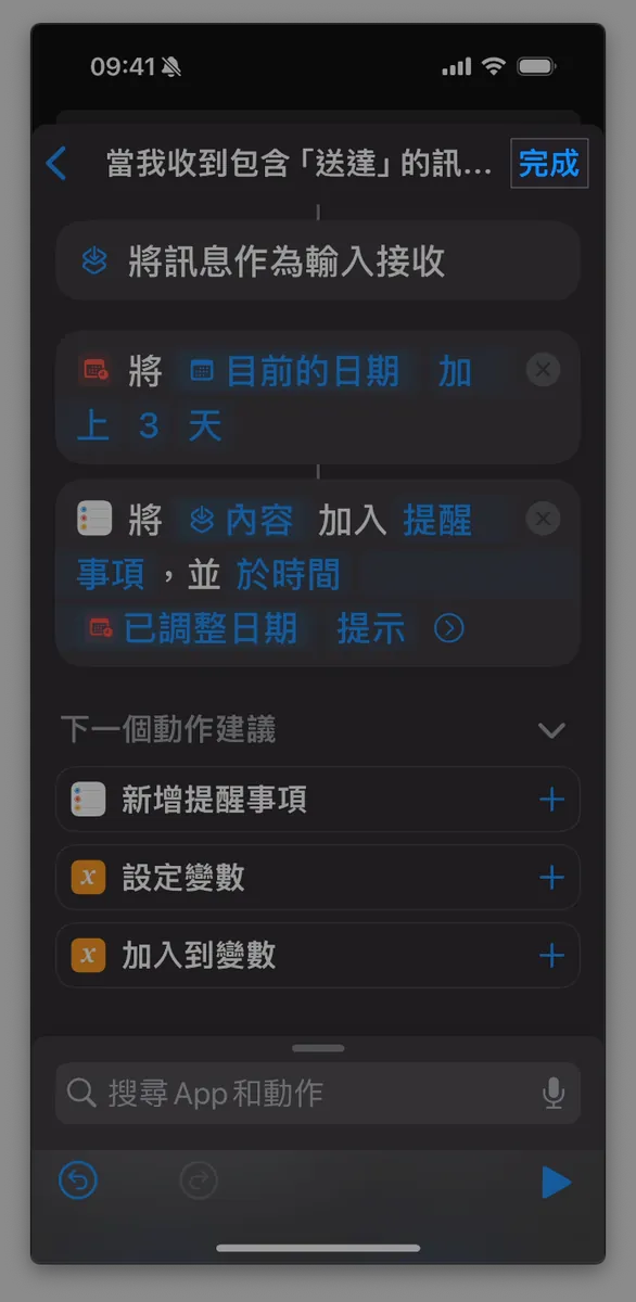 先設定提醒事項的到期日,新增一個日期變數,計算當收到訊息的時間開始 + 多少時間等於我們要的提醒時間。
