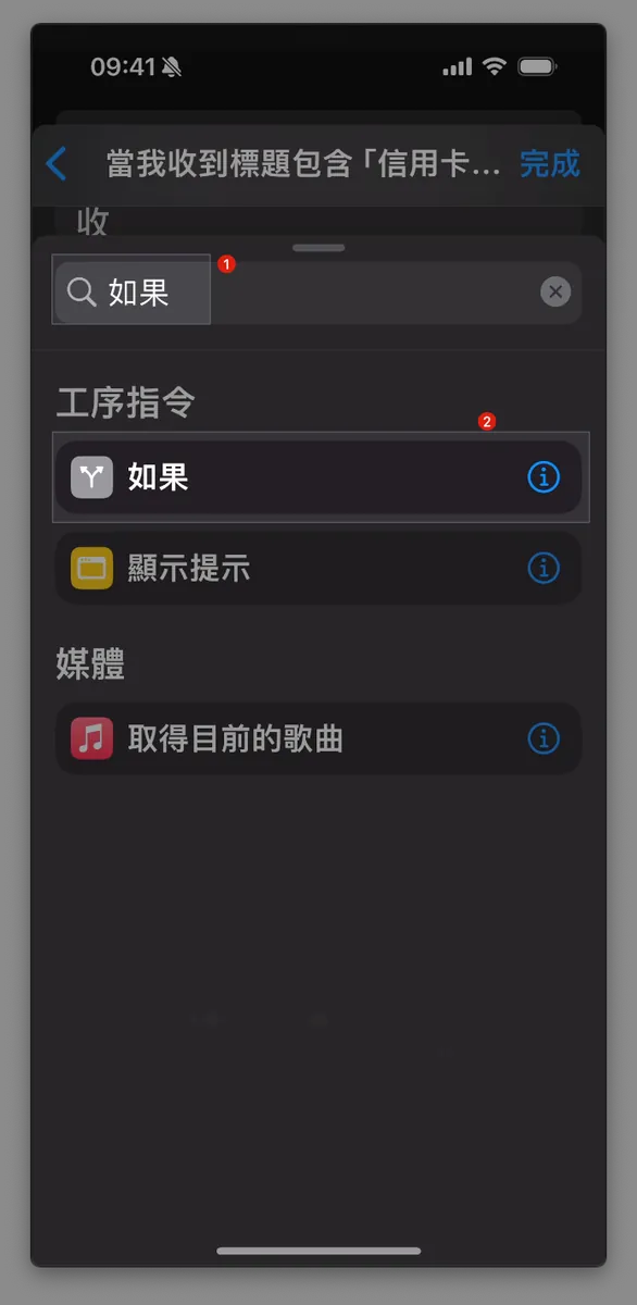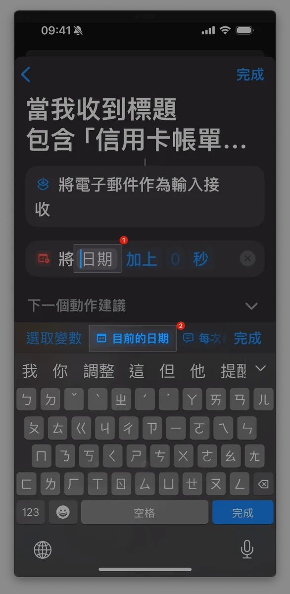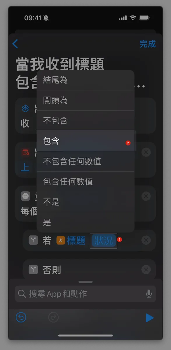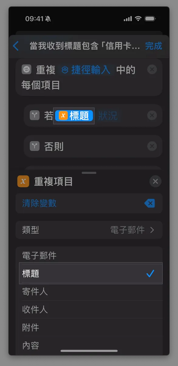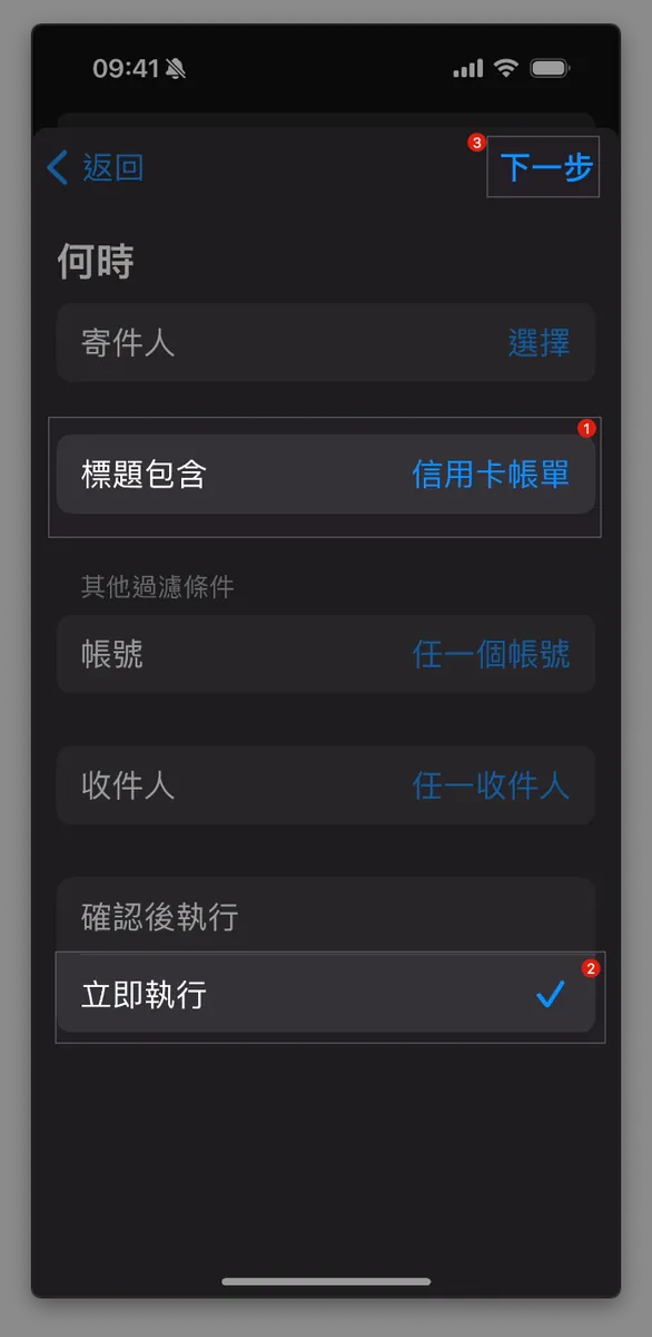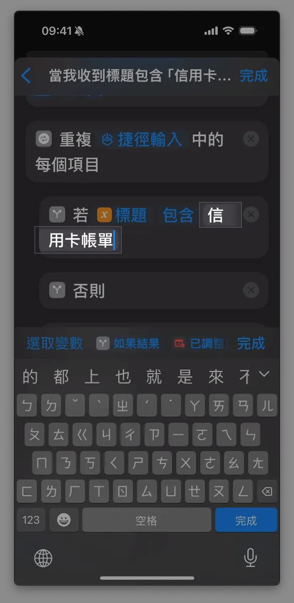 若「標題」「狀況」的「標題」輸入匡,改選擇「包含」,輸入「信用卡帳單」,點擊鍵盤的「完成」