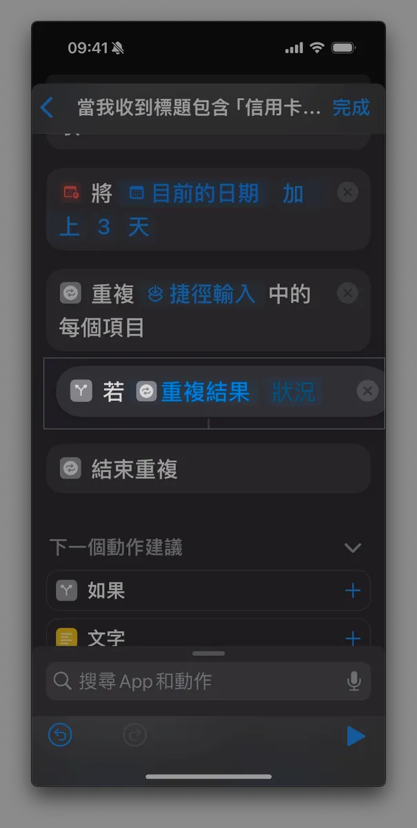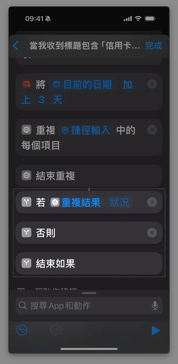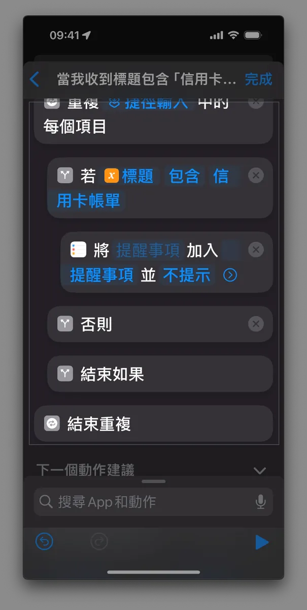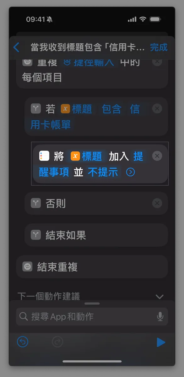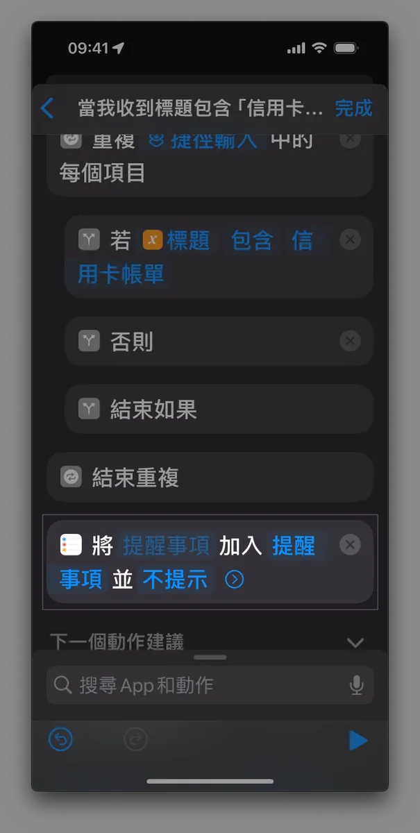 將「提醒事項」加入「提醒事項」並「不提示」動作到若「標題」「包含」「信用卡帳單」下面(內) - 確認最終位置圖如上圖三,如果不對請刪除重複跟如果並從上一步重新操作