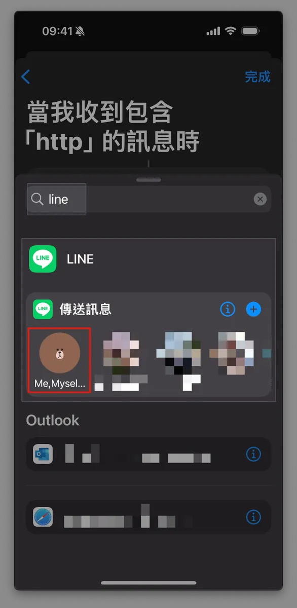「line」搜尋 Line 提供的捷徑功能,找到 Line的「傳送訊息」選擇想傳送的目標