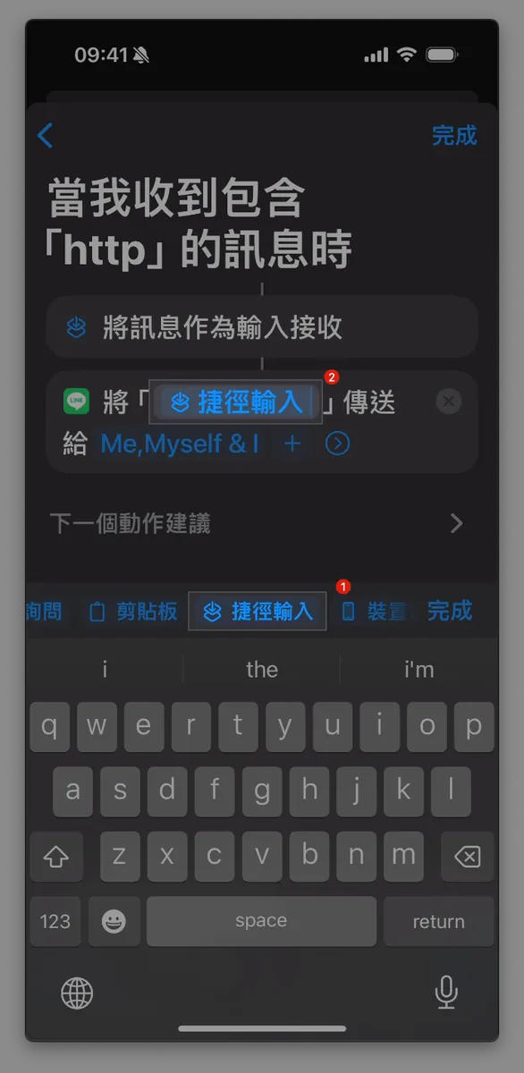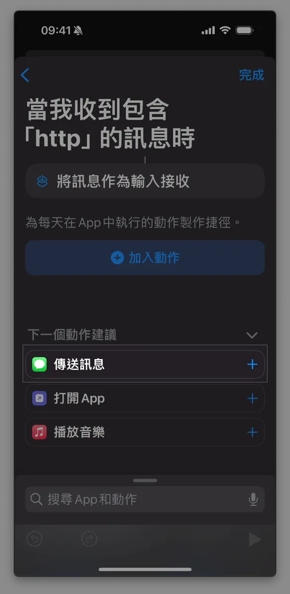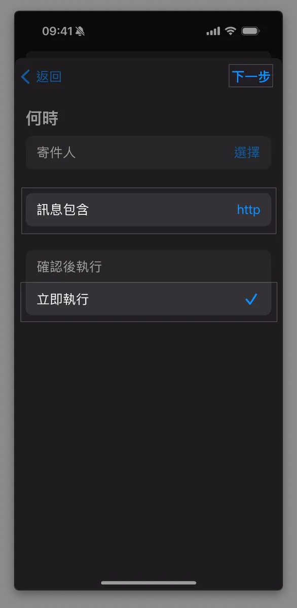 http( =有附網址的簡訊都會轉發 ) 多個關鍵字要個別建立多個捷徑。 「確認後執行」改成「立即執行」- 點擊
