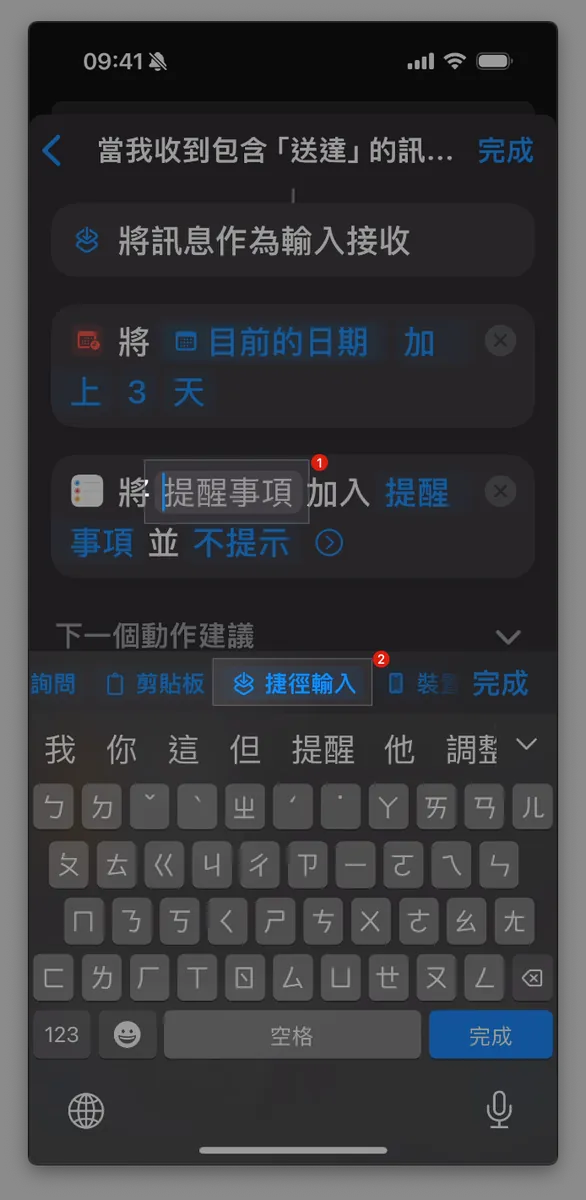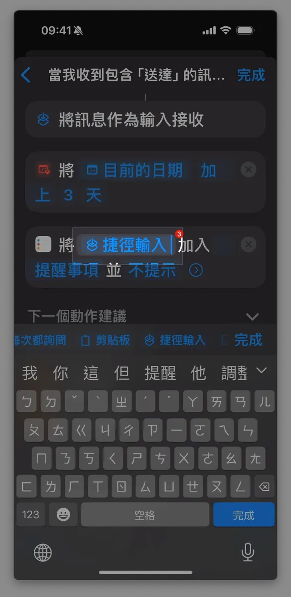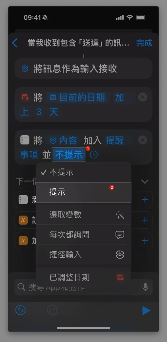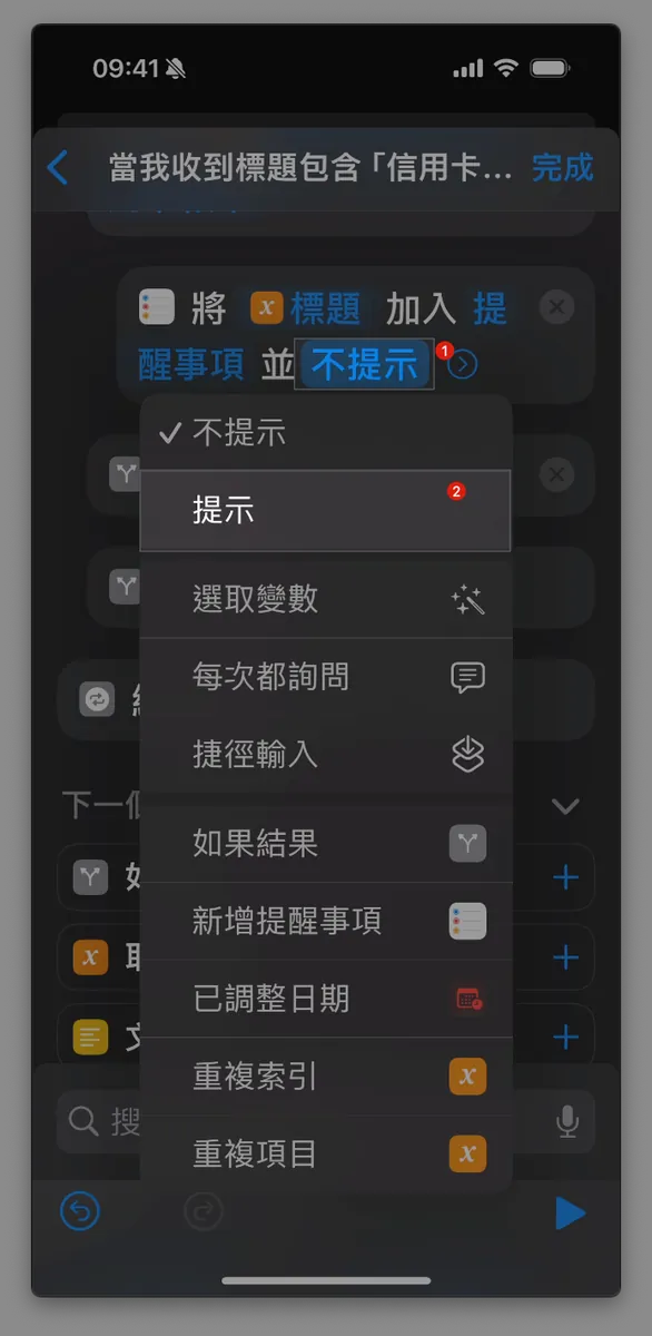將「捷徑輸入」加入「提醒事項」並不提示,的「捷徑輸入」輸入匡 - 跳出下方選單,將原本選擇的