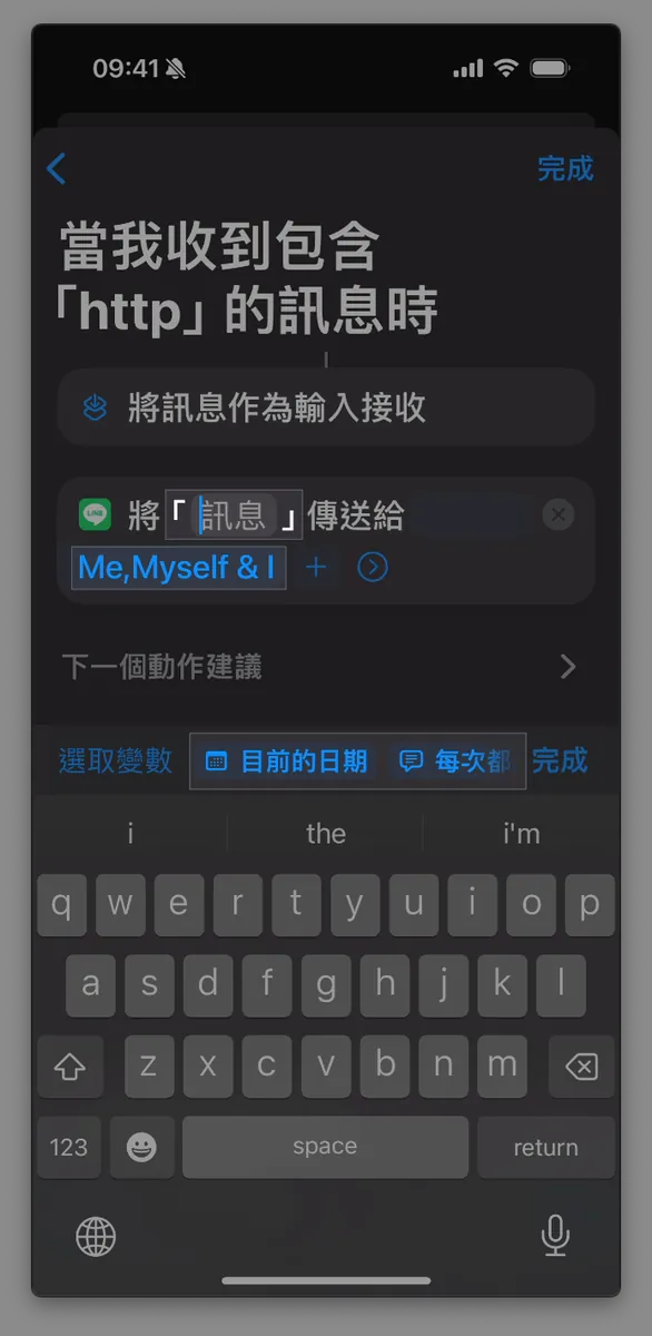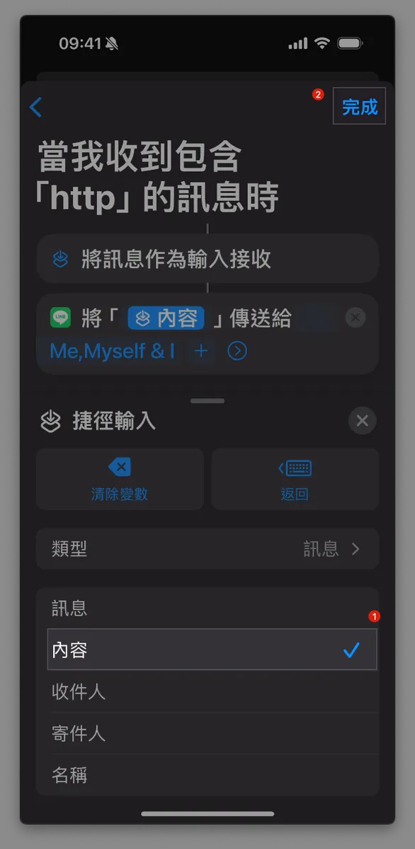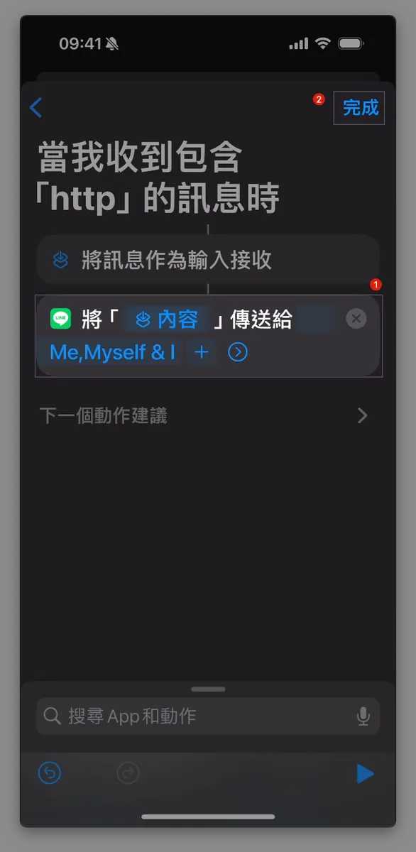 當我收到包含「XXX」的訊息時,將訊息作為輸入接收,Line 將「內容」傳送給「XXX」 - 沒問題點擊右上角「完成」 如果點完成沒反應那可能是遇到 iOS Bug,可以不管他直接點返回回到首頁。