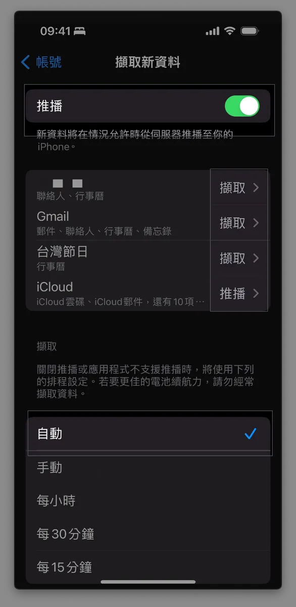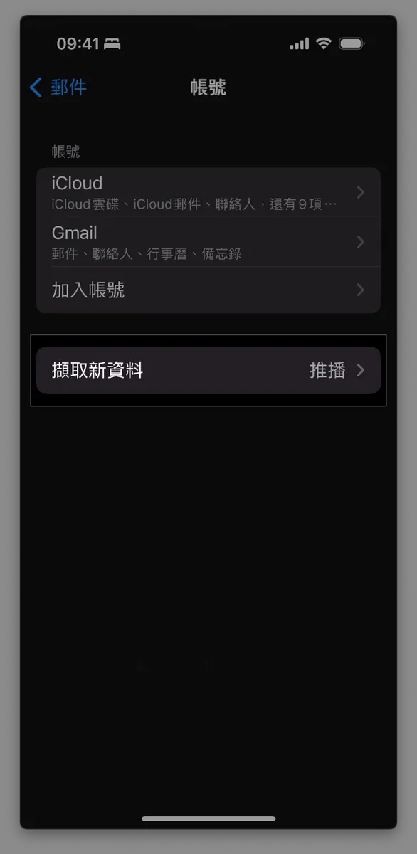 確認「設定」->「郵件」->「帳號」->「擷取新資料」設定為擷取或推播。
