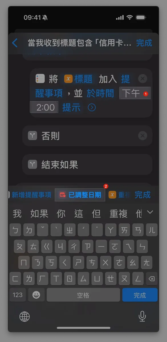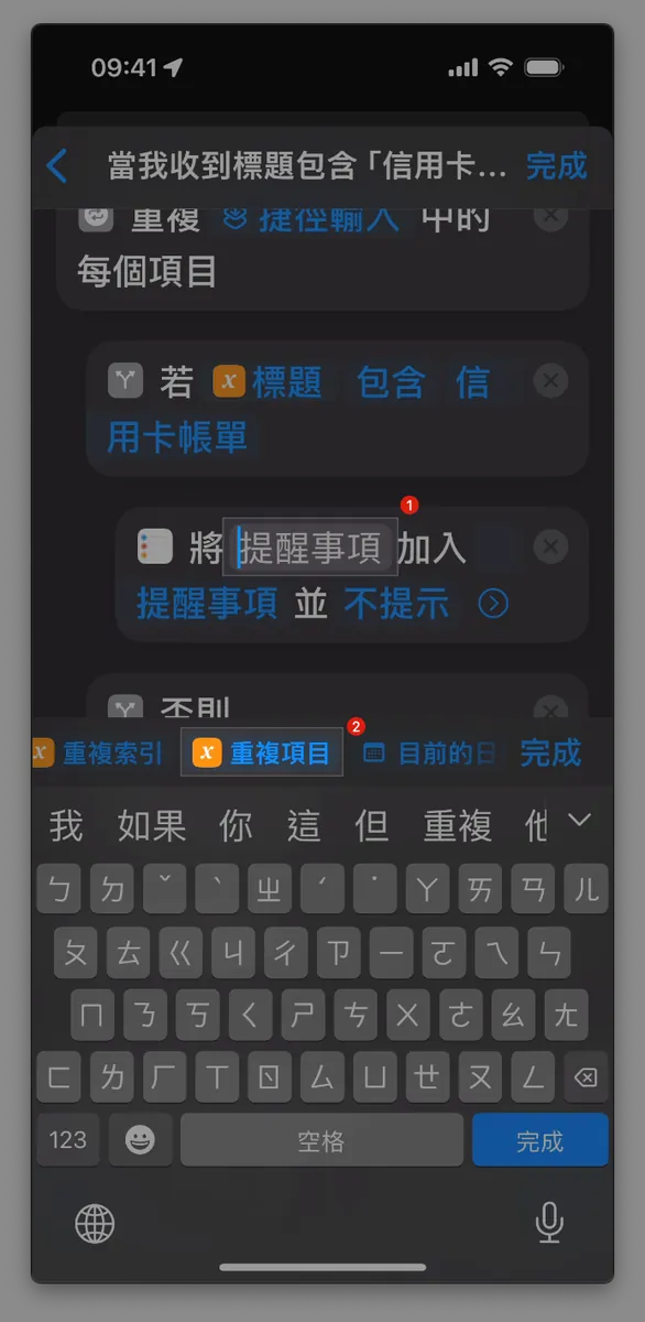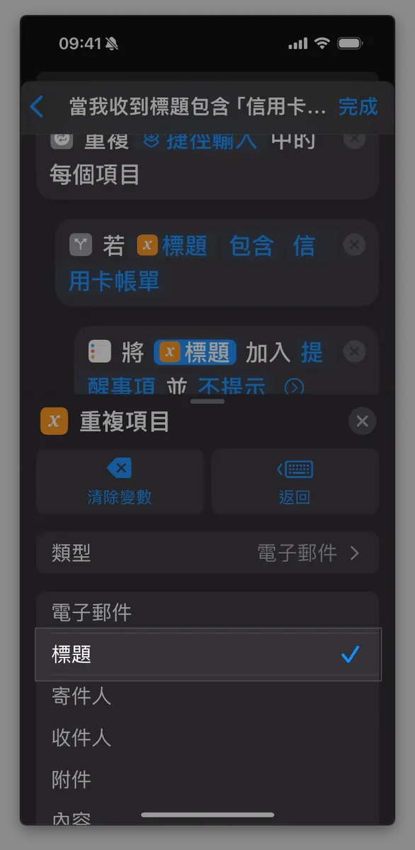 - 當收到電子郵件標題包含「信用卡帳單」時新增提醒事項