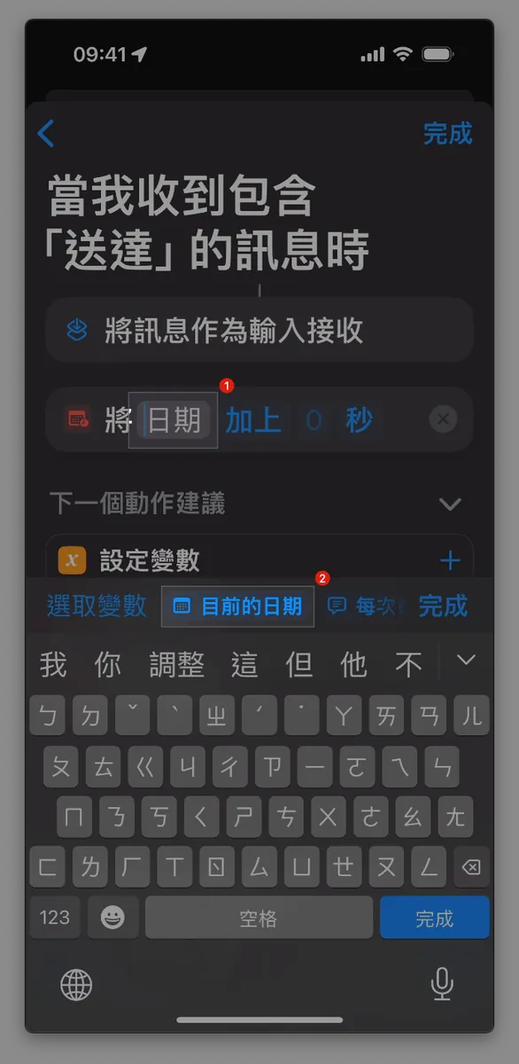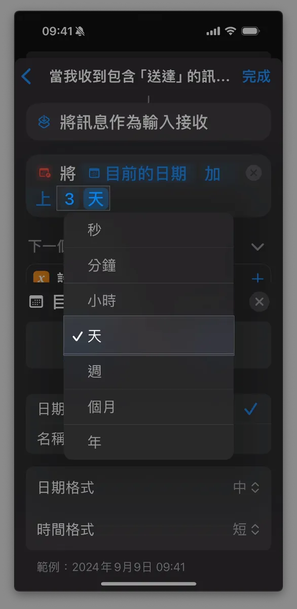 首先我們要先設定提醒事項的到期日,新增一個日期變數,計算當收到訊息的時間開始 + 多少時間等於我們要的提醒時間。
