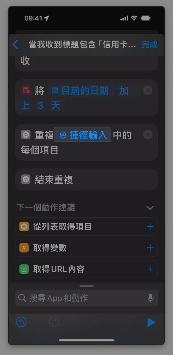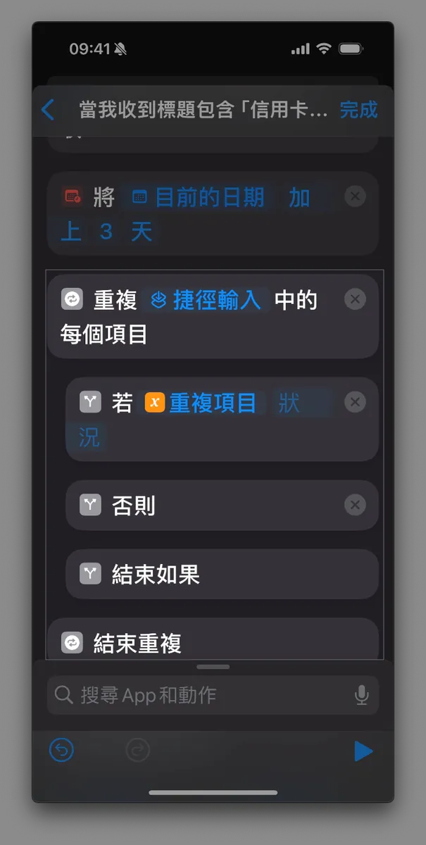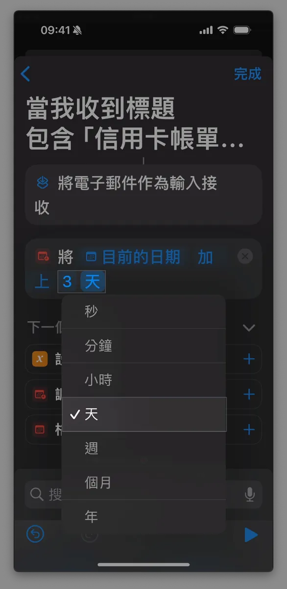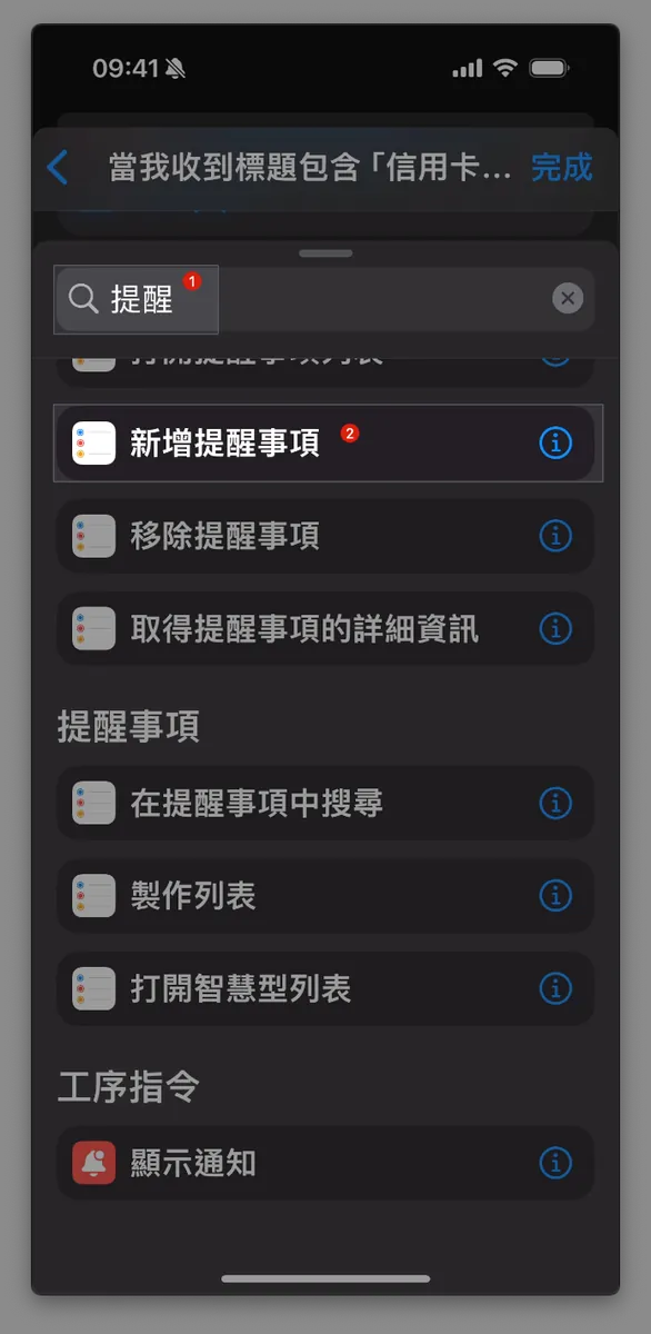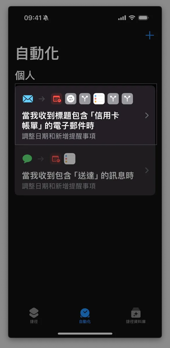 另一個生活通知是信用卡帳單通知;設定類似簡訊,當收到電子郵件時也能觸發捷徑自動化新增提醒事項;但因目前自動化功能未開放給第三方 App,所以只能使用 Apple 郵件 App 觸發。
