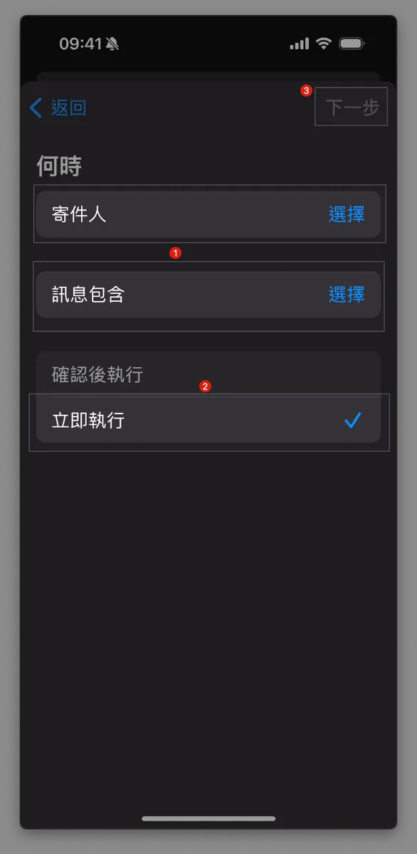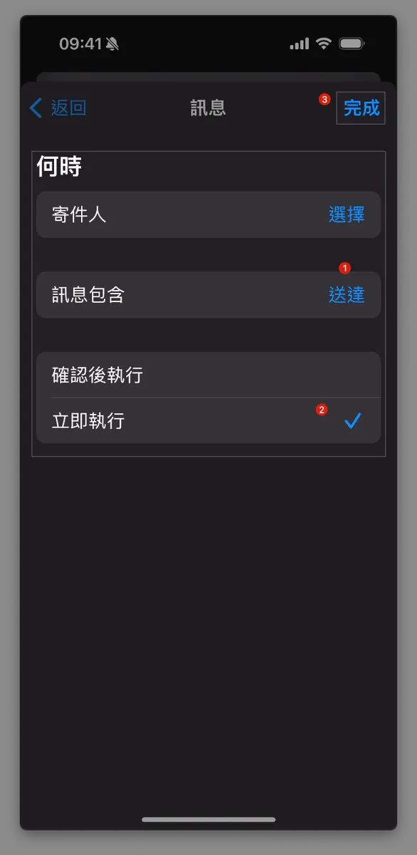 同前文自動轉發簡訊介紹的何時條件,這邊設定 訊息內容包含「送達」 和改成 「立即執行」 。